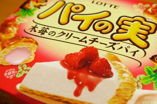 ロッテの期間限定商品「パイの実 木苺のクリームチーズパイ」のレビュー。木苺のクリームチーズ味のチョコレートがパイの中に。