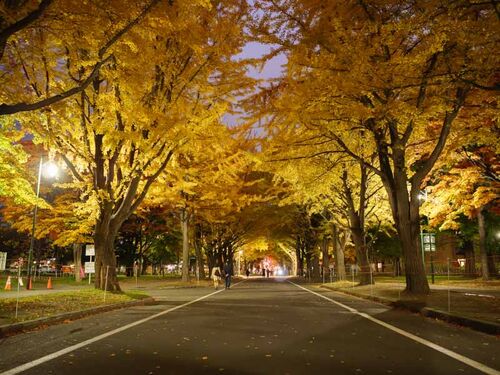 北海道大学のイチョウ並木。黄金色に彩られたイチョウの葉が秋を知らせます。雪虫が飛び交い、冬が目前に迫ってきました。
